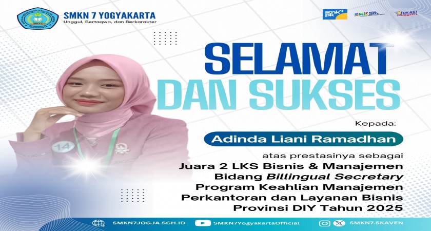 Selamat dan sukses kepada Adinda Liani Ramadhan atas prestasinya sebagai Juara 2 LKS Bisnis dan Manajemen Bidang Billingual Secretary Program Keahlian Manajemen Perkantoran dan Layanan Bisnis Provinsi DIY Tahun 2025.