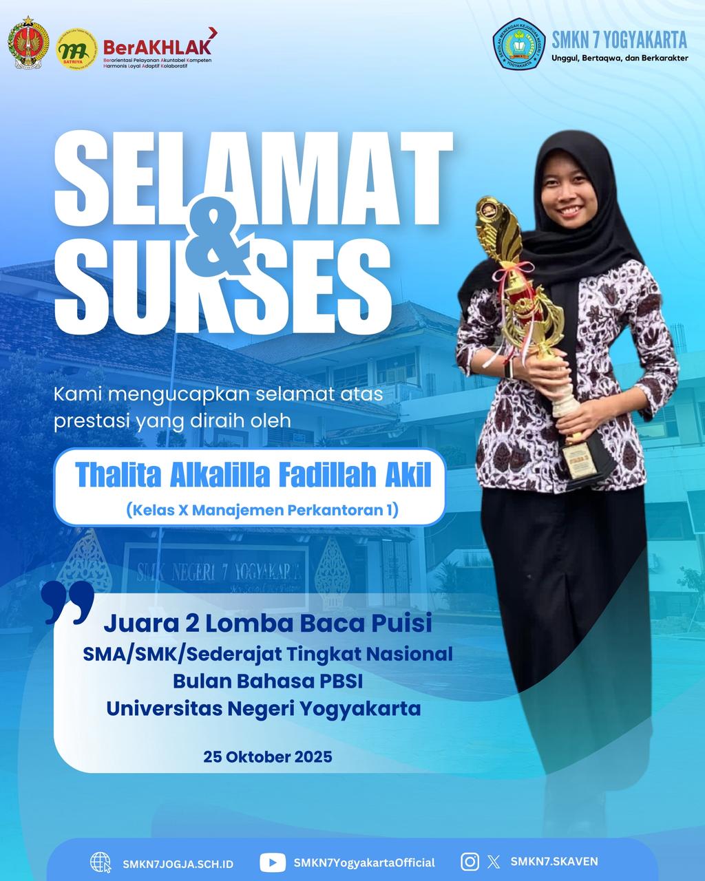 Selamat dan sukses atas prestasi yang diraih oleh Thalita Alkalila Fadillah Akil (X MP 1) sebagai Juara 2 Lomba Baca Puisi SMA/SMK/Sederajat Tingkat Nasional Bulan Bahasa PBSI Universitas Negeri Yogyakarta.