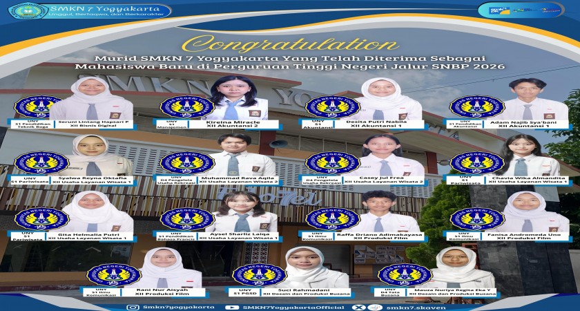 Selamat dan sukses untuk murid SMK Negeri 7 Yogyakarta yang telah diterima sebagai Mahasiswa Baru di Perguruan Tinggi Negeri Jalur SNBP 2026: